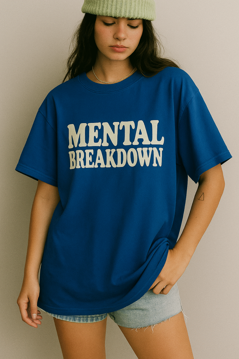 This Oversized Blue Mental Breakdown Tee from Art Illusion is made for the girls who feel everything — and still show up looking iconic. The rich blue color hits deep, and the DTF graphic brings the chaos to life with clean, bold detail.